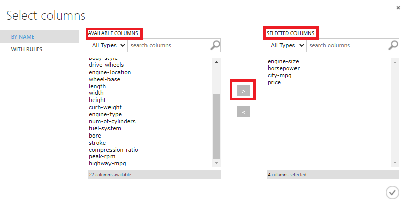 저희가 price에 영향을 주는 3요소로 선택한 engine size/ horse power/ city-mpg를 옮겨놓고 우측하단의 체크표시를 눌러주시면 적용이 완료됩니다 :)