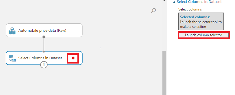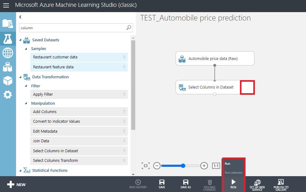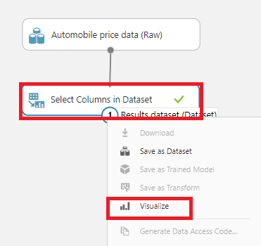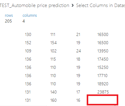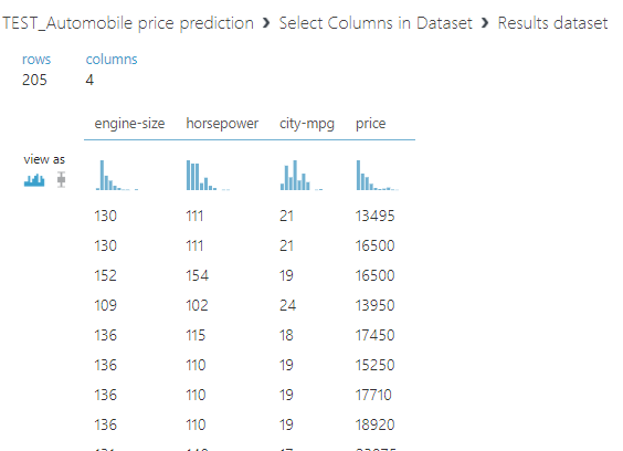 위의 Automobile price data와 Select columns in Dataset 블록을 마우스로 줄을연결해주고,
