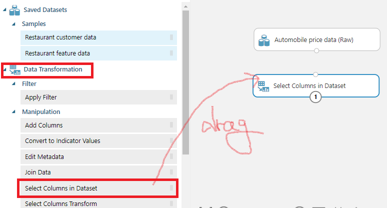 [Data Transformation] -> [Manipulation] -> [Select Columns in Dataset]을 Drag하여 Block code에 옮겨줍니다!
