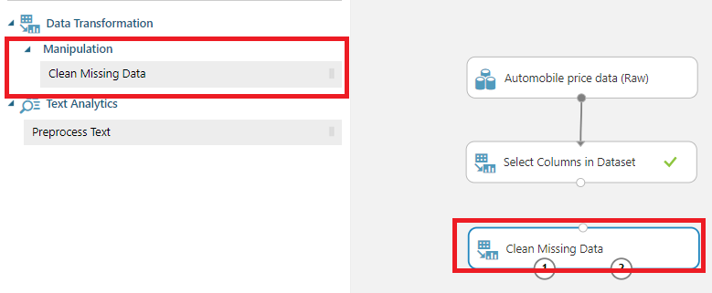 이렇게 문제가 있는값들을 처리하기 위해선 [Manipulation] -> [Clean Missing Data] 블록을 옮겨줍니다.