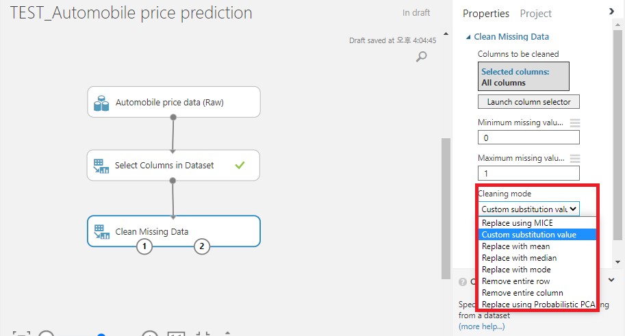 블록은 연결해주고, [Clean Missing Data]를 클릭해주면 오른쪽에 [Cleaning mode]가 있는데요