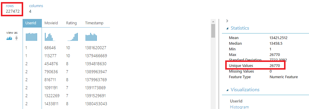 눈여겨보실점은, 영화 전체 Rows는 22만개인데 반해, UserID는 26770개의 Unique Values를 가지고 있습니다.