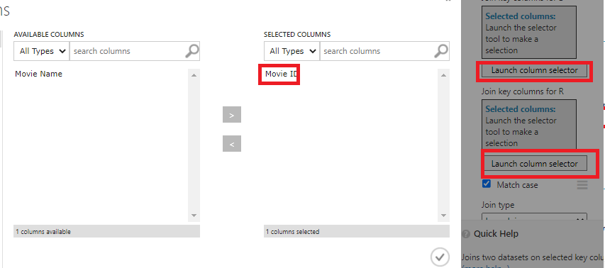 저희는 [Movie ID]를 기준으로 두개 데이터 모두 동일한 값을 가지고 있기에 [Launch Column Selector]에서 두개 데이터 모두 movie ID를 select해줍니다.