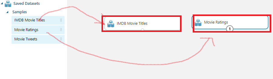 [Saved Datasets] -> [Samples] -> [IMDB Movie Titles], [Movie Ratings] Block을 옮겨줍니다.
