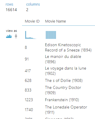 Movie ID와 Movie Name 2Column으로 이루어진 16614개의 데이터입니다.