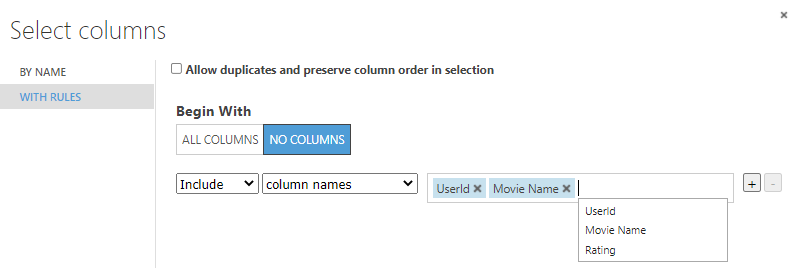 블록 내부세팅을 User ID/Movie Name으로 해주면, 같은 User ID가 똑같은 Movie Name을 중복평가한 경우, 1개만 남기고 다 삭제해버립니다.