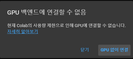 현재 Colab의 사용량 제한으로 인해 GPU에 연결할 수 없습니다.현재 Colab의 사용량 제한으로 인해 GPU에 연결할 수 없습니다.현재 Colab의 사용량 제한으로 인해 GPU에 연결할 수 없습니다.