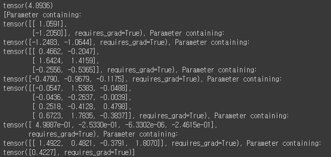 이것으로, 결과값을 해석해보자면, 첫 Tensor에서 2행 1열의 값이 나오게되고(nn.Linaer(1,2))