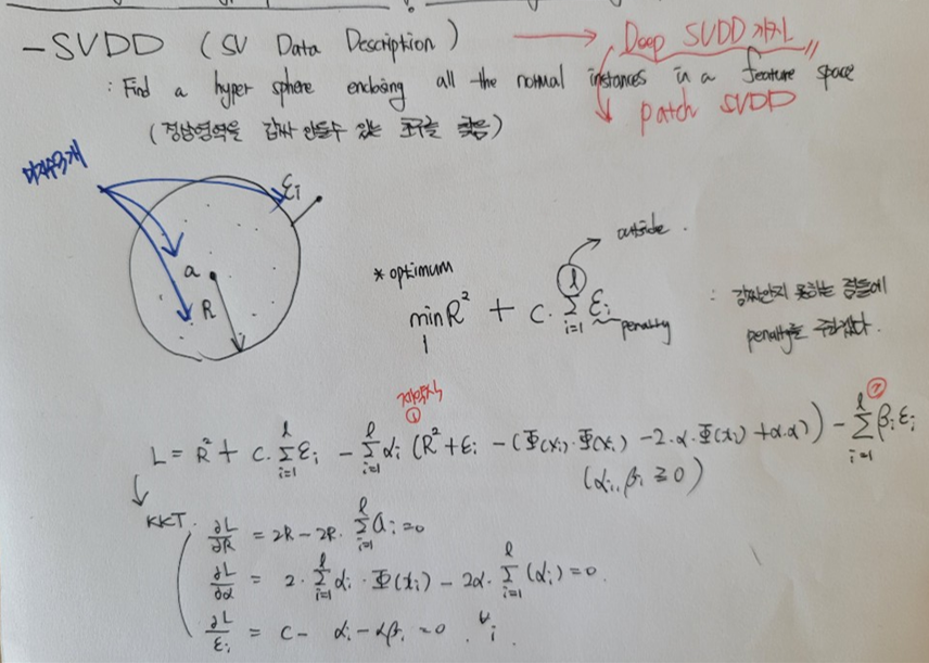 OC-SVM이 psi,w,lo 3개가 변수였다면, SVDD는 R(hypershpere의 반지름), psi, a(원의 중심)이 변수입니다.