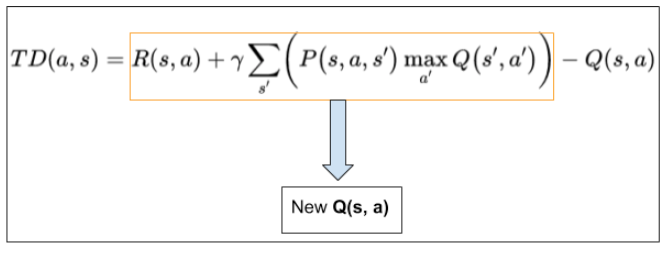 TD = R_new[current_state, next_state] + gamma * Q[next_state, np.argmax(Q[next_state,])] - Q[current_state, next_state]
