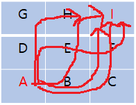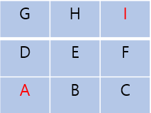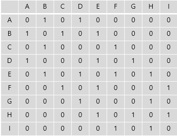상/하/좌/우로만 움직일 수 있다고 가정할 때, A는 B와D로만 갈수 있고, B는 A,E,C로 갈 수 있습니다.