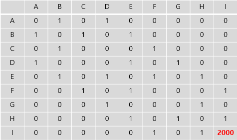 우리는 A에서 I까지 가기로했기에 I의 보상을 2000정도로 주겠습니다.