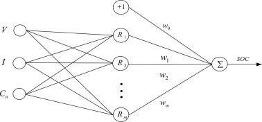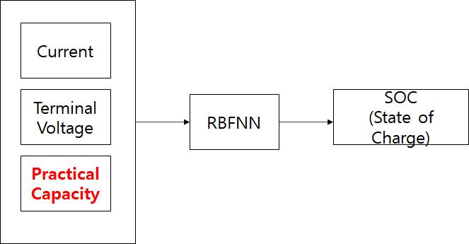 RBFNN(Radial Basis Function Network)을 통해 배터리 SOC를 추정하겠다는 논문으로, 특이점은 Input Data로 온도-Cycle수로 얻어낸 Practical Capacity(SOH가 반영된 용량으로 보면됨)을 사용한다는 것입니다. 이것을 통해 논문 필자는 SOH가 반영된 SOC를 얻어낼 수 있다고 합니다.