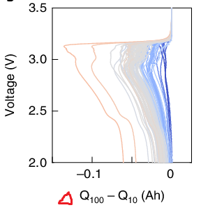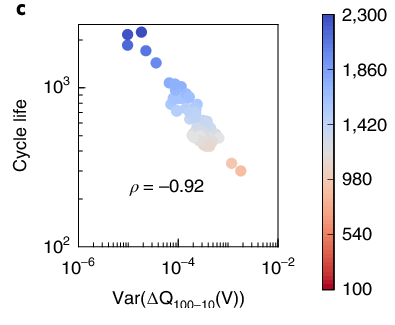 [출처] Severson, K.A., Attia, P.M., Jin, N. et al. Data-driven prediction of battery cycle life before capacity degradation. Nat Energy 4, 383–391 (2019). https://doi.org/10.1038/s41560-019-0356-8