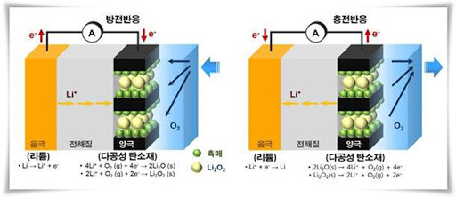 특히 리튬과 산소는 반응성이 아주 뛰어날뿐더러, 양극재로 산소를 사용할 경우 도전재로 리튬이온배터리와 동일하게 C 혹은 CNT(탄소나노튜브)를 사용하는데