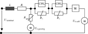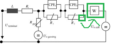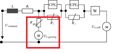 위와같은 VRLA의 셀 특성때문에 붉은색 친 부분의 소자들을 의미합니다. 기존의 전기적 모델에 전해액이 분해되는 정도를 반영한 것입니다.