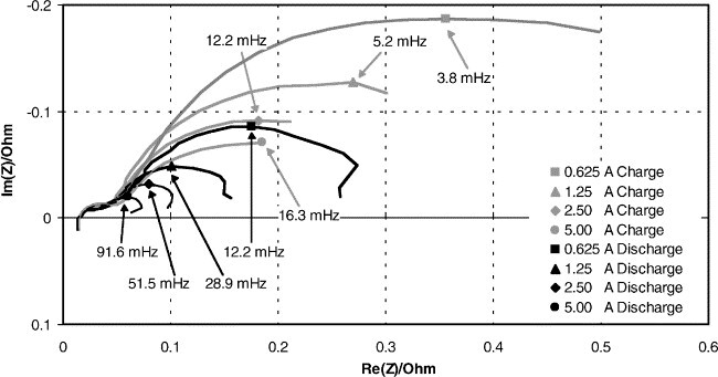 위의 그림처럼, 각 C-rate별(낮은 전류들) 충/방전 케이스를 나누어 EIS가 그려지는것들을 볼 수 있는데요