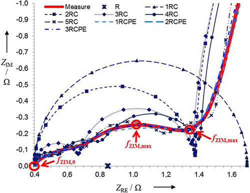 Fzim,0(이하 F_0)은 IR을 의미하며, Fzim,min(이하 F_min)은 Polarization Resistance, Fzim,max(이하 F_max)는 Nyquist plot의 Semicircle의 꼭대기지점, 즉 Warburg를 제외한 Charge Transfer반응에서의 Z_imag값이 가장 클때를 의미합니다.