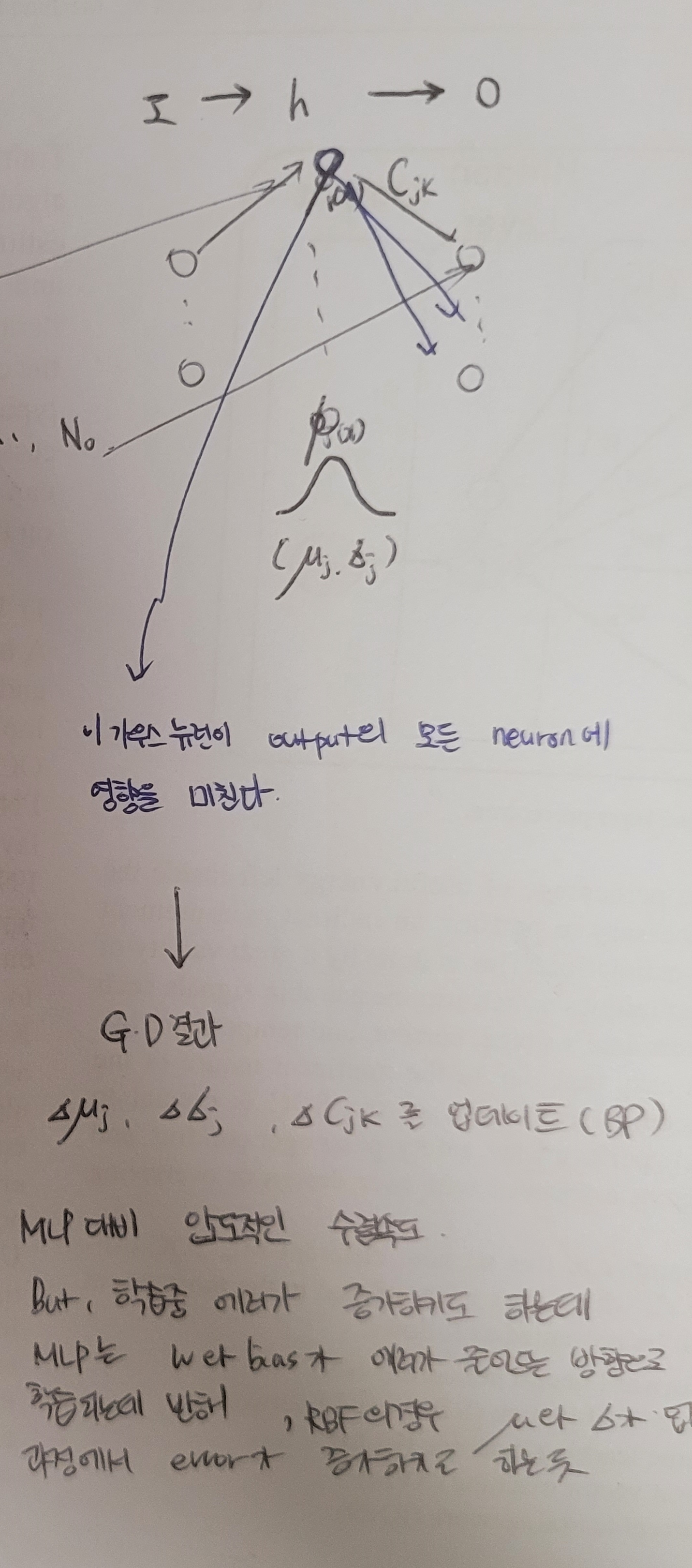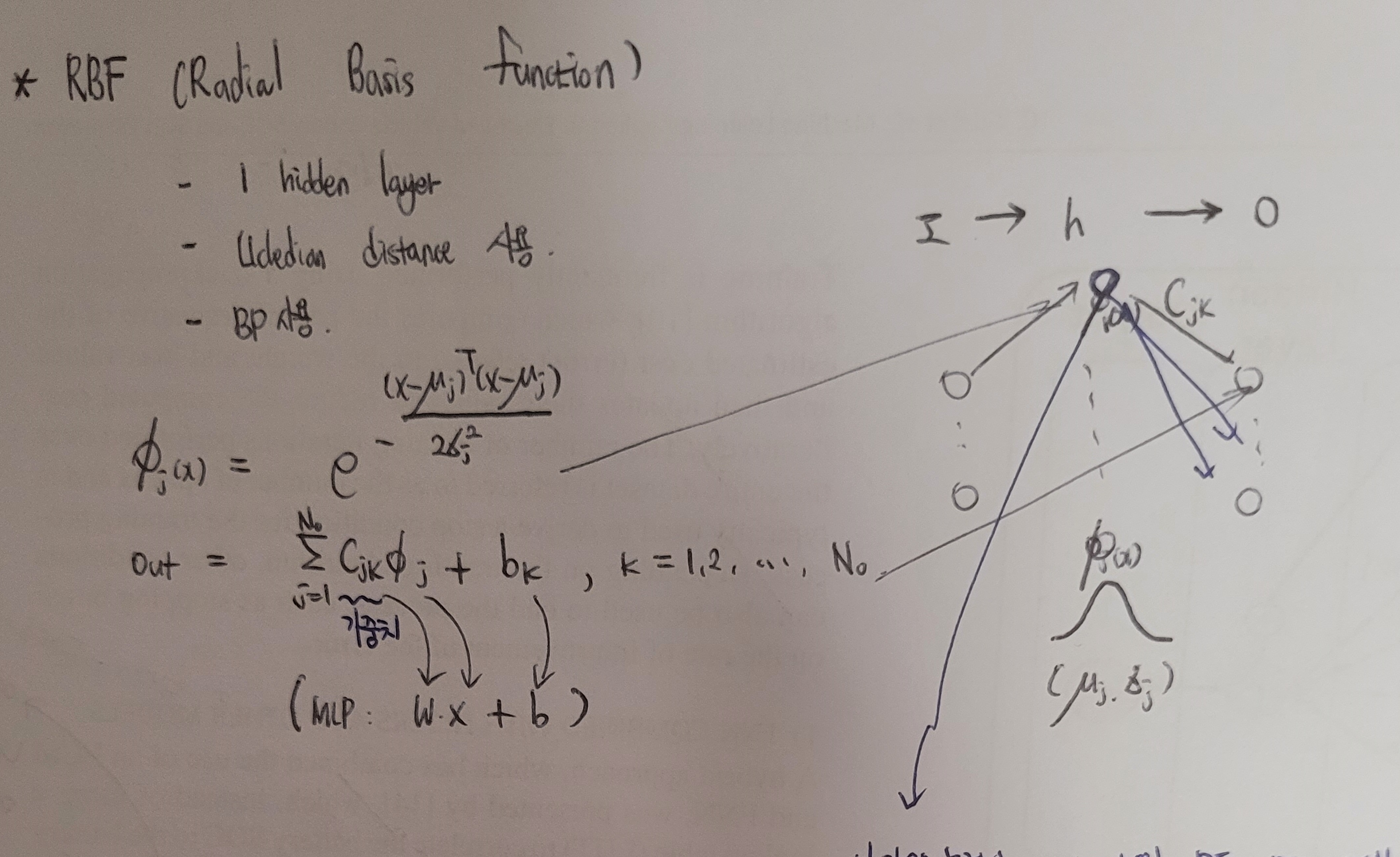 제가 필기한걸 캡쳐해보았는데요, RBF는 1개 히든레이어를 가진 뉴럴네트워크입니다.