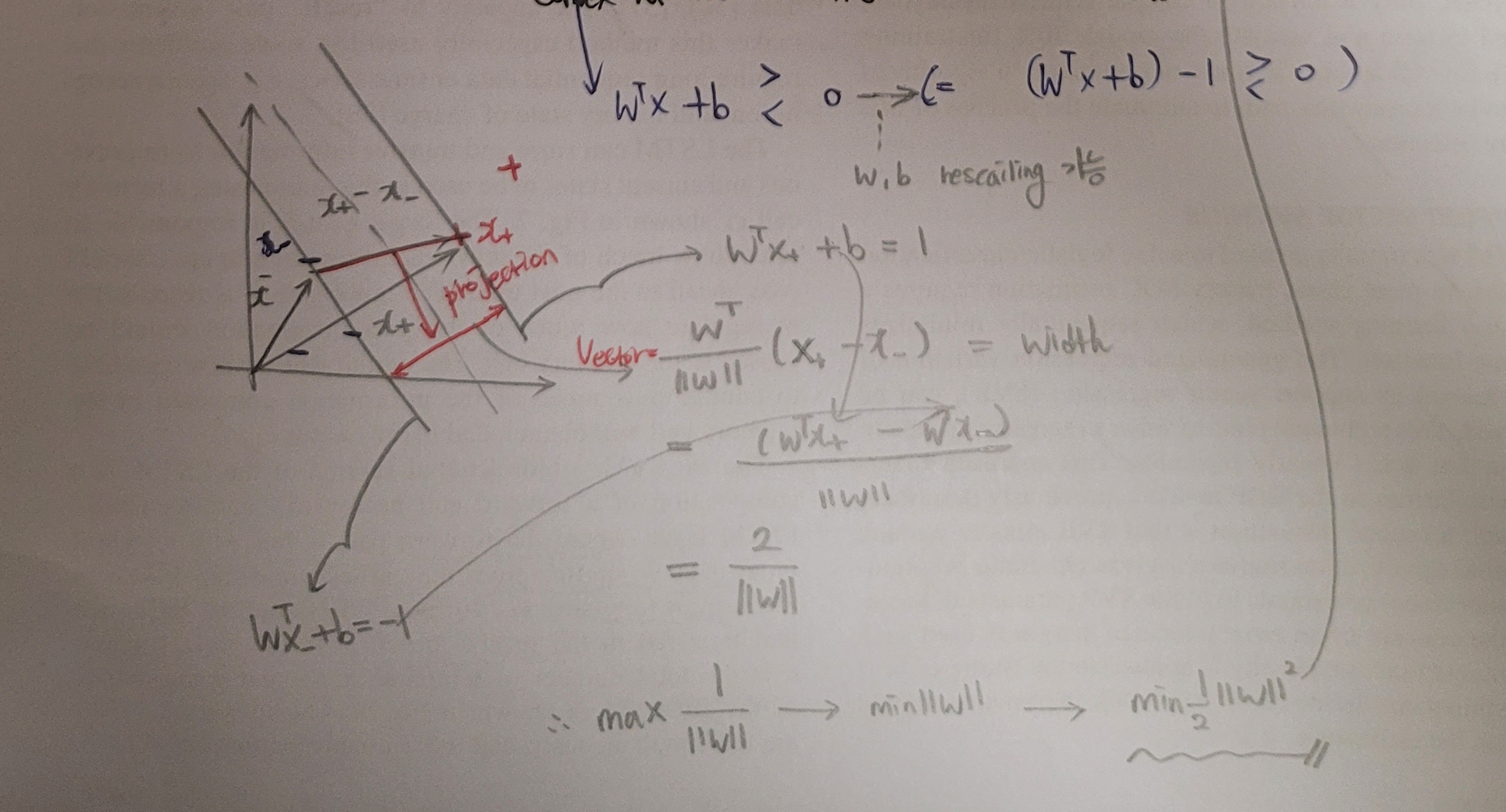 선형대수학의 정사영(Projection) 공식을 통해, 서포트벡터와 Hyper plane사이의 거리는 2/llwll가 됩니다.