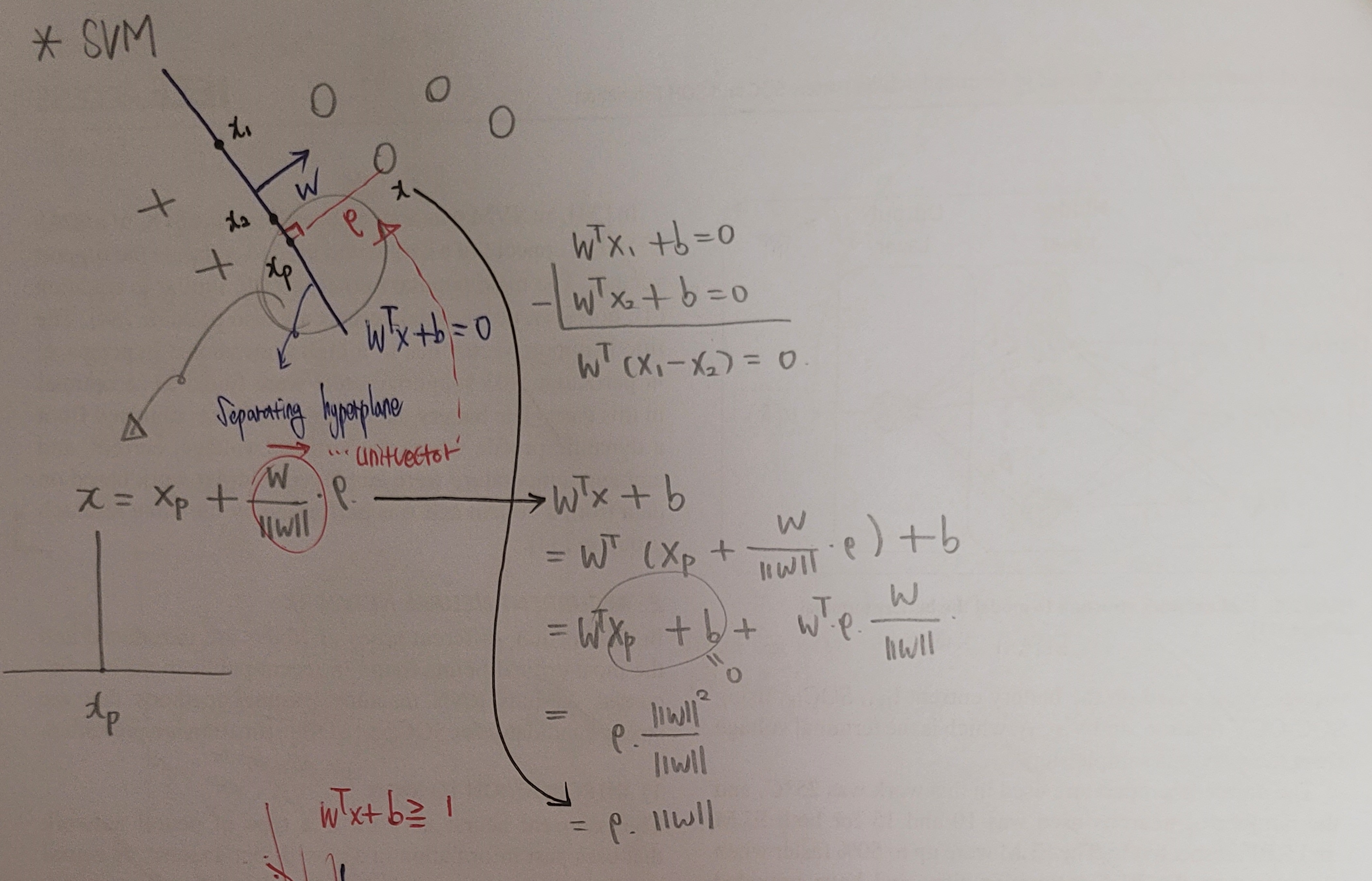 2-Dimension기준 Hyper plane이 y=wx+b라고 치면 서포트벡터와 해당 직선사이의 거리는 서포트벡터가 직선으로 정사영 내린 수선의 길이라고 할 수 있습니다.