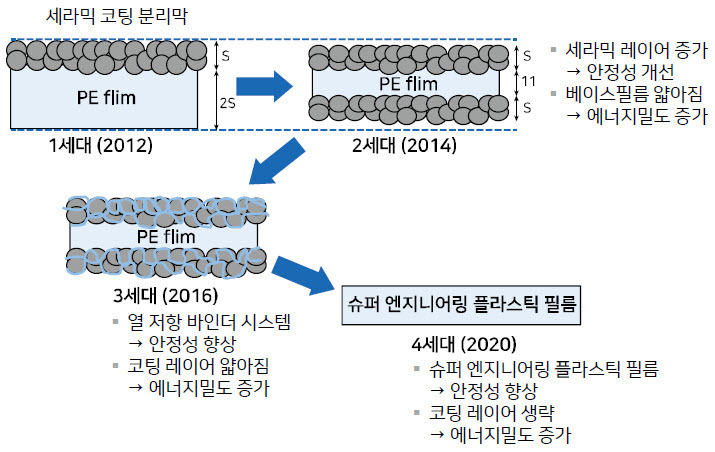 이런식으로 PE/PP 원단위에 세라믹 코팅을 하여 전자전도도 뿐만아니라 리튬덴드라이트 혹은 이물질에 의한 물리적 관통까지도 막으려고 하고있습니다.