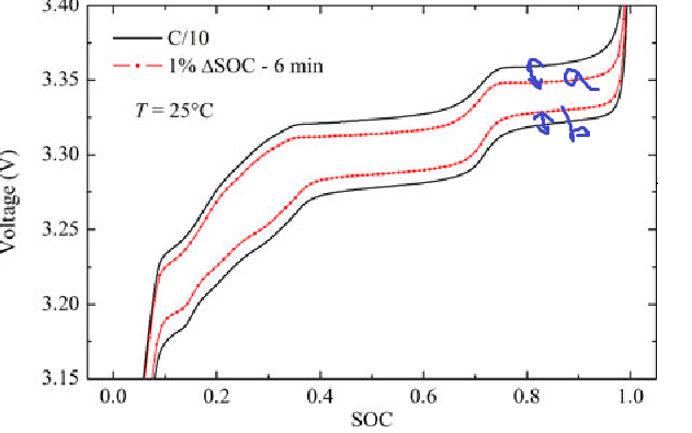 중국쪽 논문에서 이런식으로 많이하던데 아주 낮은 C-rate로 CC 충/방전하고 두개를 더한값을 OCV로 쓰는 방법이 있고, 두번째로는 특정 C-rate로 특정 SOC까지 방전하고 Rest를 길게가져가고 다시 방전하고.. 이런식으로 직접 Relaxation을 시키면서 OCV를 측정하는 방법입니다.