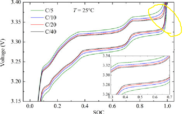 위의 그래프에서 C-rate가 높을수록 분극이 커서 전압이 높으며 SOC 100% 부근에서 빠르게 전압이 상승하는것을 확인할 수 있습니다.