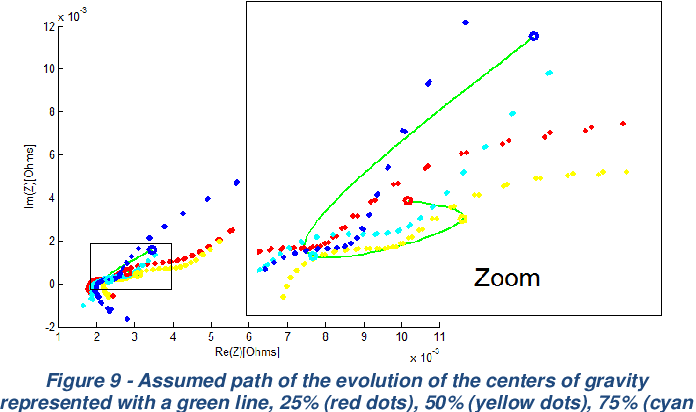 하지만 이렇게하더라도 값들이 튀는 현상을 다 막아낼순없기에 필자는 Nyquist Plot으로 그려지는 38개 주파수에 대한 COG(Center Of Gravity)지점 1개(논문에선 Centroid라고부름)를 얻어내, SOC를 추정하고자합니다.