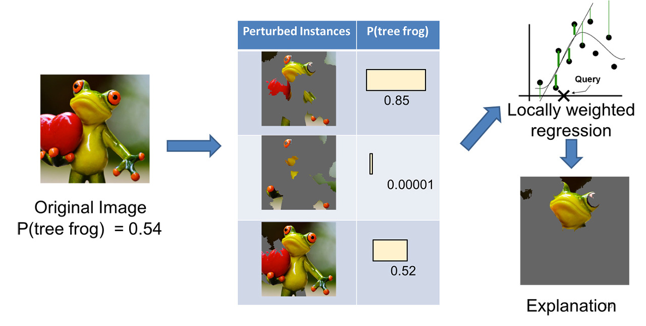 그리고 결과를 softmax를 쓰든..해서 확률의 형태로 나오게하고 각각의 잘려진 이미지들이 실제 개구리로 판단하는데 얼마만큼의 기여를 했는지 분석하는게 LIME입니다.