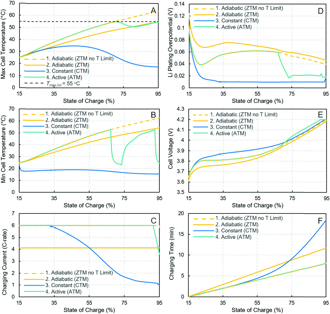 ATM의 C-rate(3행 1열) 그래프를 보면 ZTM no T limit(전류제한없음)과 거의 동일하게 6C-rate로 들어가다가 마지막 부분에 전류를 급격하게 내리는것을 확인할 수 있습니다. 그런데 제가 한가지 이해가안되는점은 냉각 및 온도에 따라 ATM으로 제어하여 셀 온도나 npp가 변동되는건 이해가 되는데 결국 평균 C-rate는 ZTM no T limit이 제일 높은데 Charging Time이 ATM과 ZTM no limit이 동일하다는 점입니다. 마지막에 전류가 떨어지는 부분에선 차이가 나야될텐데 워낙 짧은 구간이라 생략된것처럼 보이는지는 의문이네요