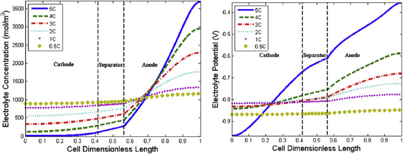 Electrolyte Concentration을 보면, 1C-rate이하에서는 상수로 봐도 무방할 정도로 배터리 셀 내 값이 일정하지만, 그 이상의 High C-rate에서는 Anode쪽에서 급격하게 증가하는것을 확인할 수 있습니다. 즉, 이런 이유때문에 Original SPM은 1C-rate이상은 정확도 보장이 힘들다고 흔히 알려져있습니다. 이런 문제를 해결하고자, P2D처럼 복잡하게 미분방정식을 쓸순 없으니 적어도 상수처리하던 Electrolyte Concentration을 Polynomial Equation으로라도 표현하고자 하는 시도들이 있었고, 이를 통해 정확도를 '그나마' 올릴 수 있었습니다.