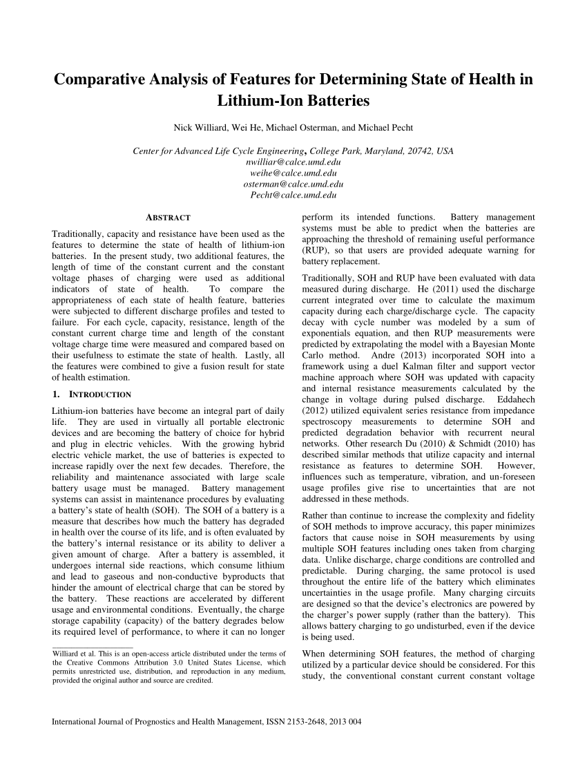 [1] Williard, Nick & He, Wei & Osterman, Michael & Pecht, Michael. (2013). Comparative Analysis of Features for Determinig State of Health in Lithium-Ion Batteries. International Journal of Prognostics and Health Management. 4. 10.36001/ijphm.2013.v4i1.1437. https://doi.org/10.1016/j.jpowsour.2016.07.036.