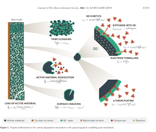 이 논문이 시사하는 바는, 상기 5가지 열화과정 외에도 Electrolye drying, gas formation, current collector corroison... 수많은 열화 메커니즘들이 있고, 이것들을 모델링하는 수학적 접근에 관한 논문들이 있지만, 상기 5개에 집중하면 실제 열화에 가장 근사하는 전기화학 모델링을 할 수 있다는 점입니다.