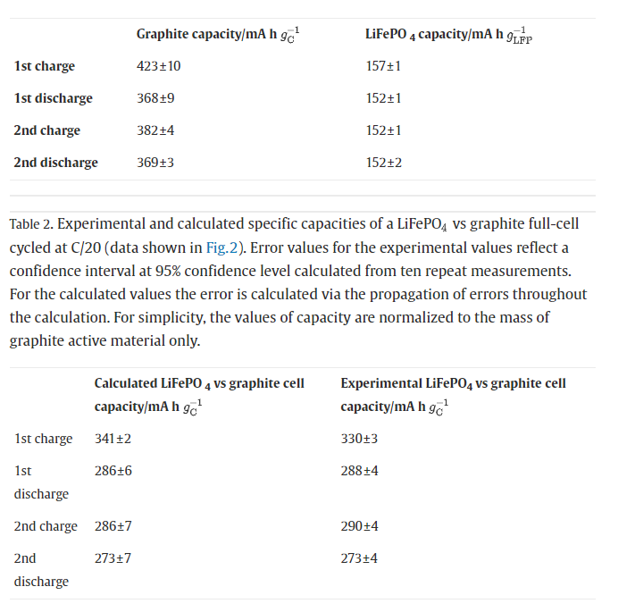 Half cell에서 C-rates 연산을 위한 specific capacity는 LFP 155mah, Graphite 370mah입니다.