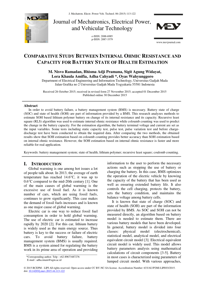 [1] Ramadan, M. & Pramana, Bhisma & Widayat, Sigit & Amifia, Lora & Cahyadi, Adha & Wahyunggoro, Oyas. (2015). Comparative Study Between Internal Ohmic Resistance and Capacity for Battery State of Health Estimation. Journal of Mechatronics, Electrical Power, and Vehicular Technology. 6. 113. 10.14203/j.mev.2015.v6.113-122.