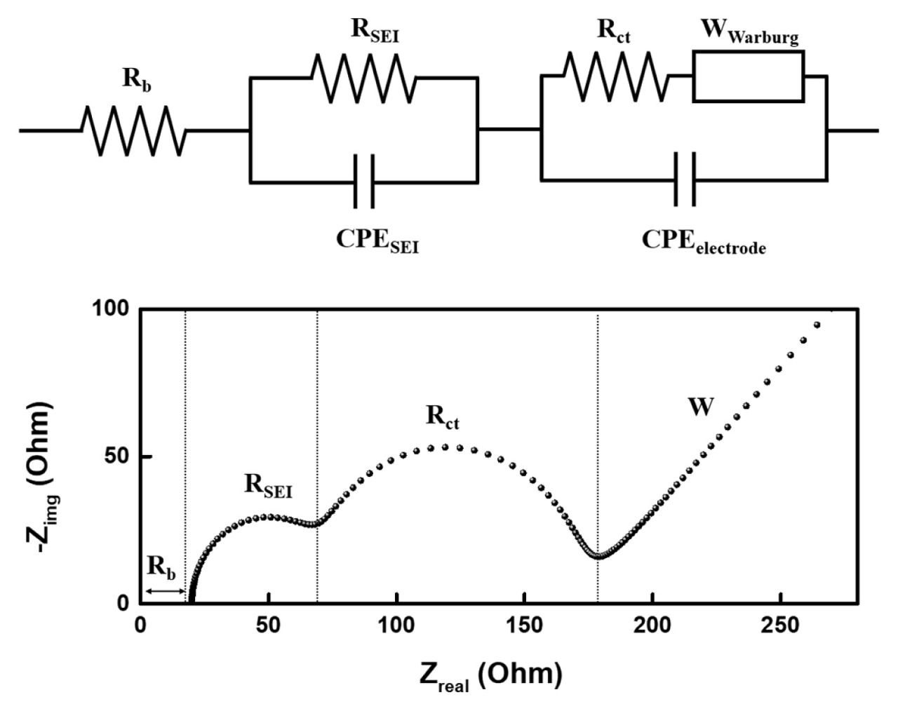 여기서 조금 유의깊게 봐야하는점은 , Rct입니다. Charge Transfer에 의해 발생하는 저항으로 Surface coating, Phase transition, Bandgap structure, particle size에 의한 저항성분들을 Lumping 해놓았습니다.