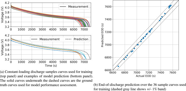 위 그림의 (c)와 같이, 학습시킨 모델만으로는 빨간색처럼 따라갔는데, 적절한 qmax, r0를 선정한 결과 더욱 잘따라갔다고합니다. 이를 통해, 결과적으로 전압을 예측할 수 있으니, 하한전압에 도달할때까지의 시간(EOD Time)을 계산하고, qmax/r0도 학습하여 SOH를 추정해냅니다.