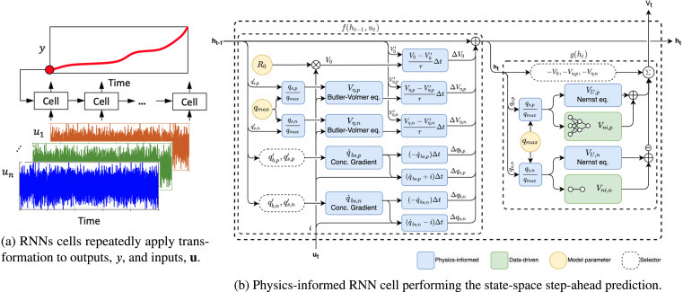 논문에서 학습하는 출력데이터는 전압입니다. 즉, 전류에 대해 전압변화특성을 학습하는데, RNN 구조를 차용하나, RNN Cell 내부는 대부분 전기화학적 수식으로 정리되어있고 분극성분에 해당하는 2개 파라미터만 작은 MLP를 통해 학습하도록 하는 구조입니다.