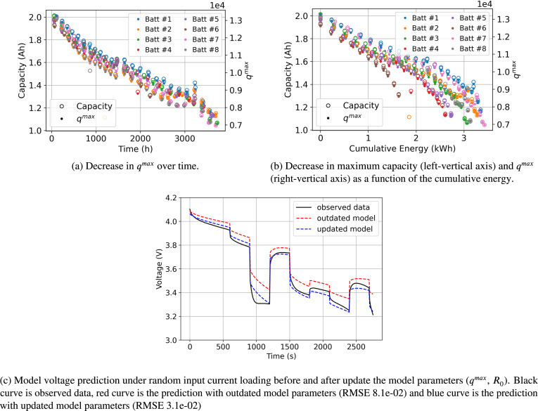 위 그림의 (c)와 같이, 학습시킨 모델만으로는 빨간색처럼 따라갔는데, 적절한 qmax, r0를 선정한 결과 더욱 잘따라갔다고합니다. 이를 통해, 결과적으로 전압을 예측할 수 있으니, 하한전압에 도달할때까지의 시간(EOD Time)을 계산하고, qmax/r0도 학습하여 SOH를 추정해냅니다.
