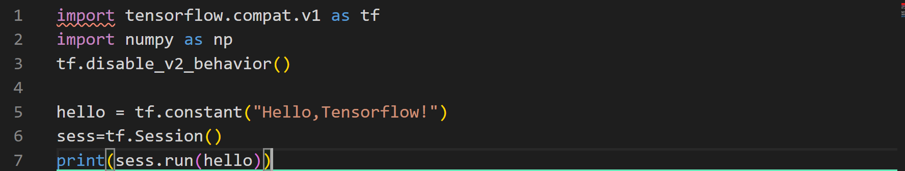 ① hello = tf.constant("Hello,tensorflow!") : hello라는 변수에 "Hello Tensorflow!"라는 문장을 저장