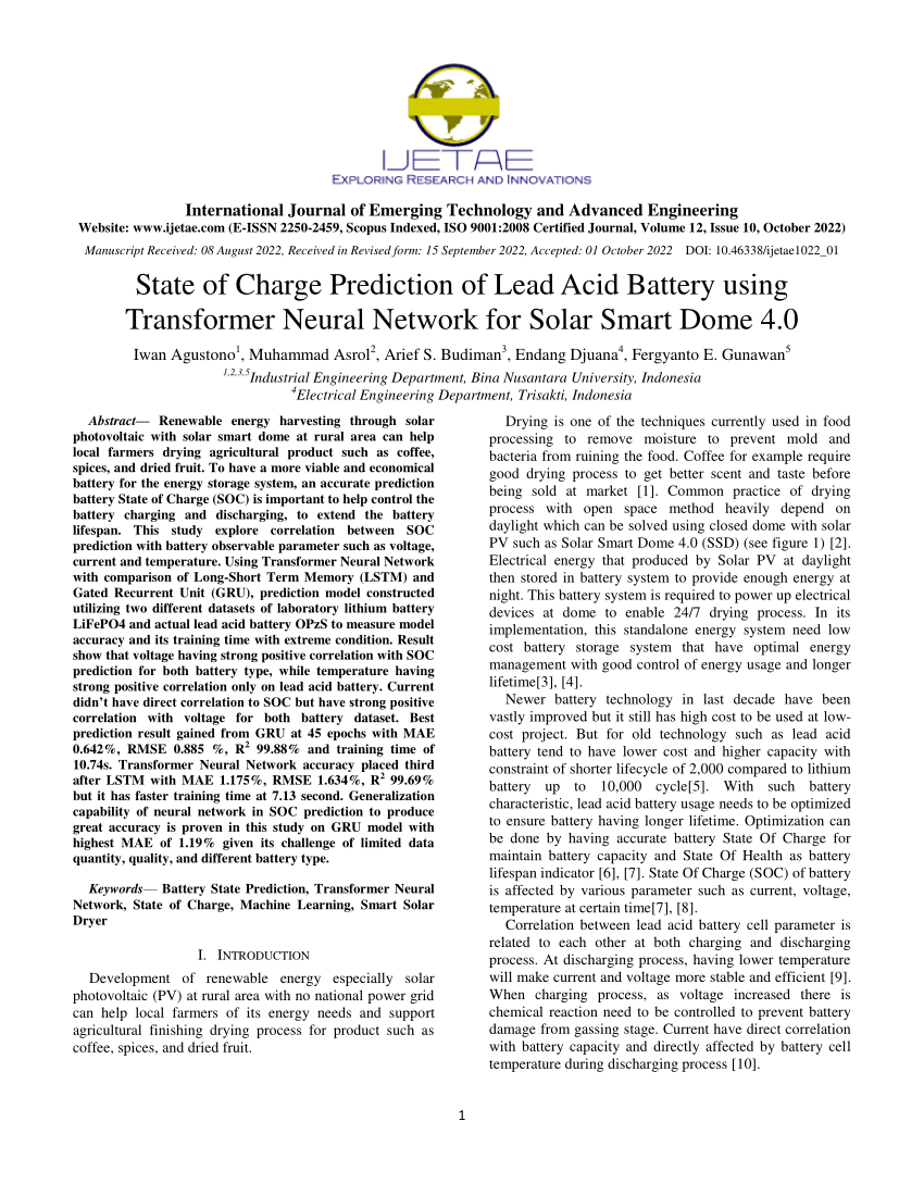 State of Charge Prediction of Lead Acid Battery using Transformer Neural Network for Solar Smart Dome 4.0
