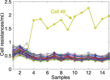 위의 그림을 보시면, 다른 정상셀 대비 저항이 4~5배까지 차이나는 셀을 가지고 진단한다고합니다.