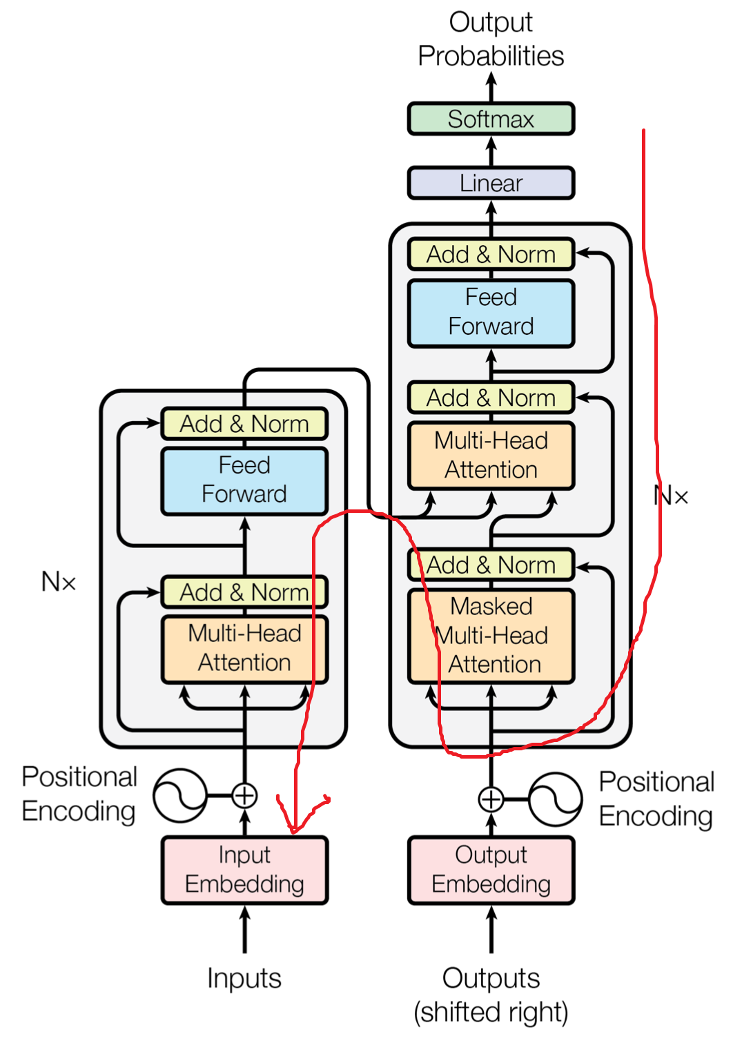 이 위의 과정들은 Transformer의 Encoder라고 불리는데, 원 논문에서는 Nx=6으로 위와 같은 과정을 6번 거쳐 Decoder로 입력됩니다.
