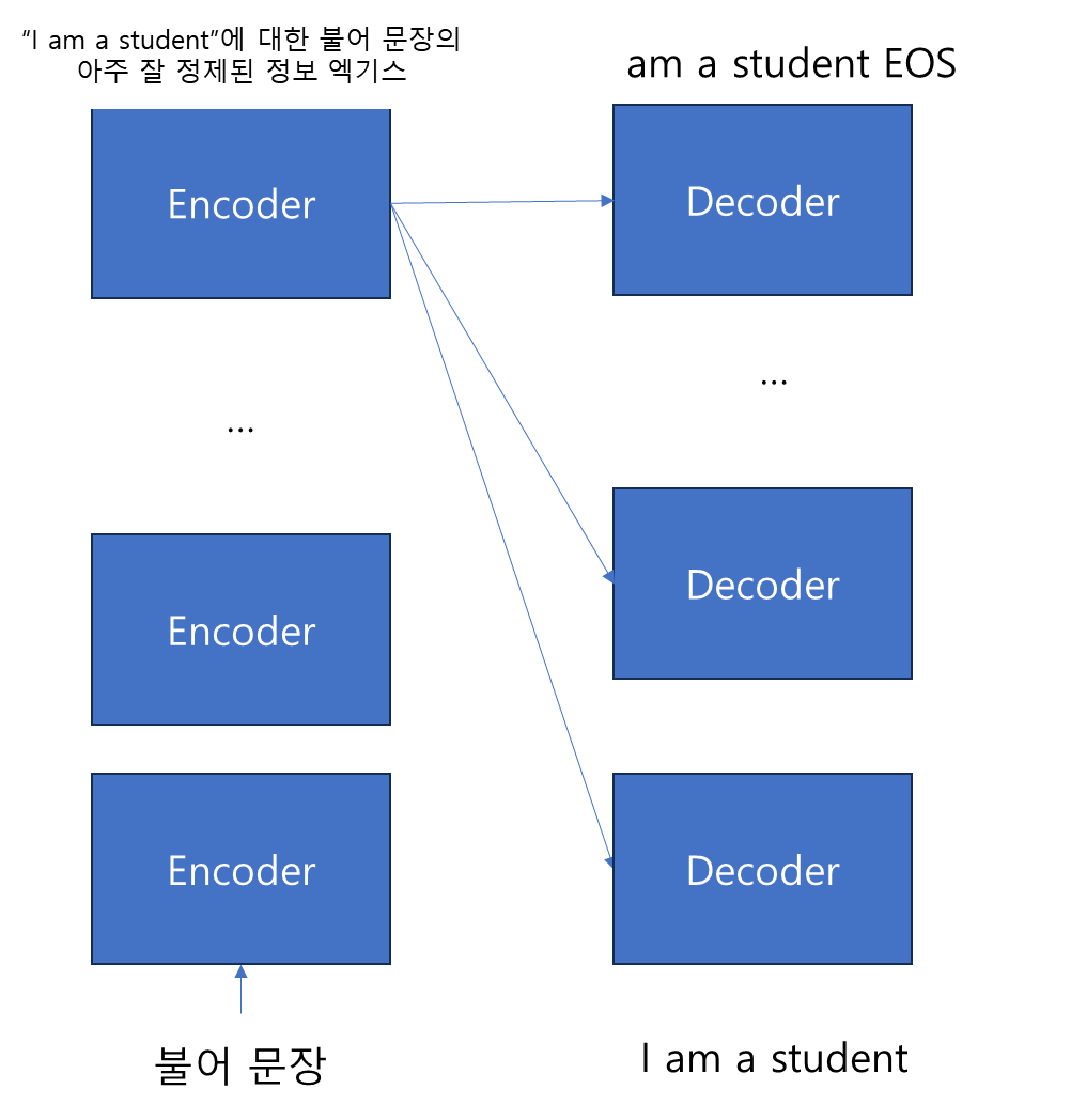 3. 추출해낸 엑기스를 Decoder에 중간부에 입력으로 하고, 영어로 I am a student라는 문장을 초기 입력으로 합니다.