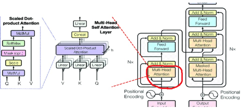 즉, Positional Encoding을 통해 Self-Attention 모델로 입력이 되는데, 이 것은 단일 모델이 아니라 여러개(원 논문 8개)의 모델을 각자 통과하여 Q/K/V(Query/Key/Value)를 학습하고 다시 다같이 Concatenate되는 방식입니다.