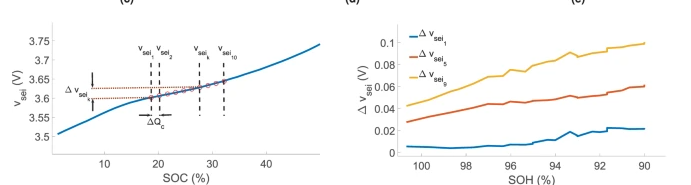 그리고, SOC 1.5%에 해당하는 용량 간격 별로 V_sei를 계산하고 직접과의 차이를 구함으로써 △V_sei를 구하는데, 이것이 위의 오른쪽 그림과 같이 SOH에 따라 증가하는 관계성을 확인했다고 합니다.