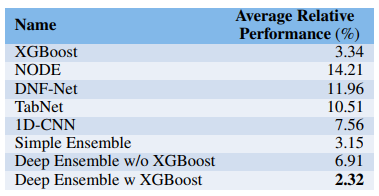 본 논문의 요점은, XGBoost(Decision Tree를 Ensemble한것) 단일 모델의 성능이 대부분의 딥러닝 스킬들 보다 성능이 좋으며, 딥러닝과 XGBoost를 Ensemble해서 쓸때의 성능이 가장 좋다는것 입니다.