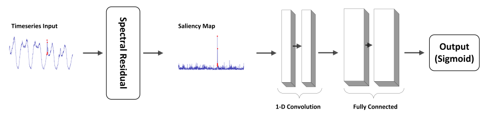 컨셉은 아주 간단합니다. Spectral Residual이라는 Vision에서 많이 쓰는 테크닉이 있는데, Time-Series 데이터를 FT(Fourier Transform)한 후, Spectral Residual을 적용하고 다시 IFT(Inverse Fourier Transform)해서 Saliency map을 보곘다는 내용입니다.