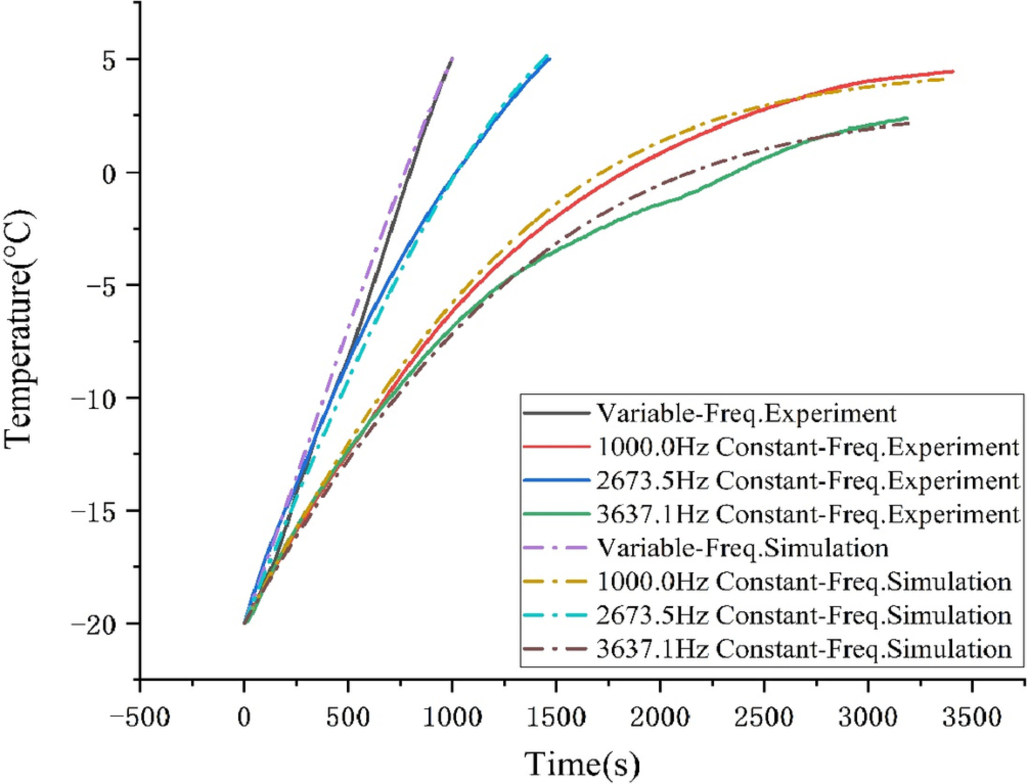 Constant Frequency(3.6kHz)제어를 했을때 발열이 가장 느림을 확인할 수 있습니다. -20도~5도까지 약 60분정도 걸리는 상황으로, 일반적인 상식상으론 고주파제어를 할수록 발열이 더 커지지않나라고 생각할수있는데 그 반대의 결과를 보여주었습니다. 오히려 1kHz제어가 발열이 더 잘된다는것 또한 놀랍네요(시뮬레이션 값이지만)